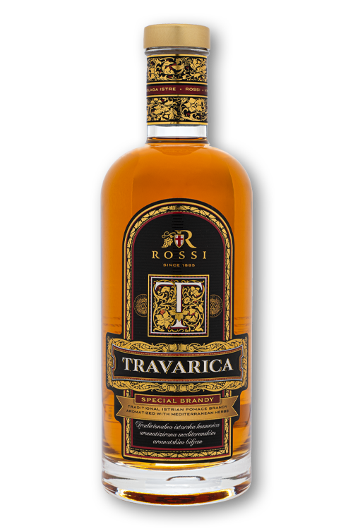 Travarica der Rossi Family ist ein traditionell hergestellter istrischer Schnaps, der aus vierfach destilliertem istrischem Malvasia-Tresterschnaps hergestellt wird und durch Mazeration von 15 mediterranen aromatischen Kräutern angereichert wird. Er reifte 6 Monate in Barriquefässern. Warme gelbe Farbe mit goldenem Reflex und feiner Dichte. In der Nase erinnert er an Walnuss, Mandeln, Haselnuss und Salbei. Am Gaumen trocken, warm und etwas säuerlich mit einem intensiven und langen, leicht bitteren Abgang.